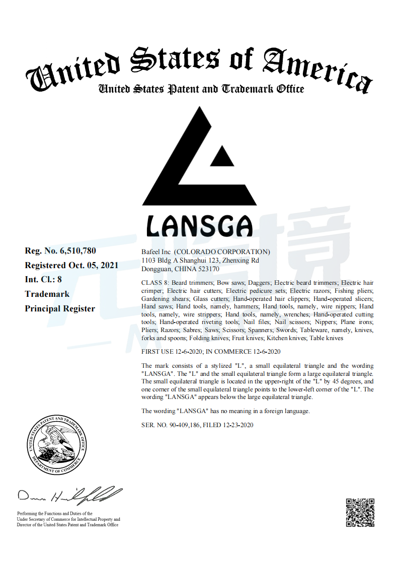 本案为商标侵权,涉及“LANSGA”商标,注册类别是第8类,涵盖工具、美妆工具、刀具、餐具四大核心品类,卖家注意不要随意使用,避免侵权