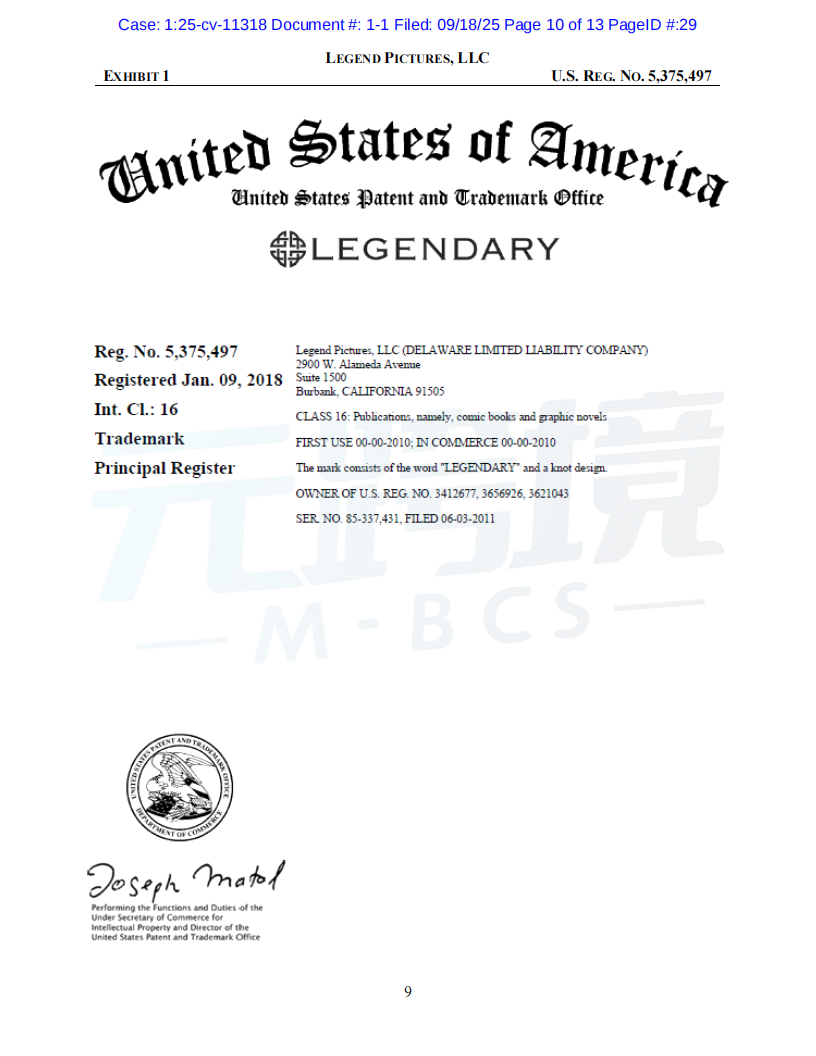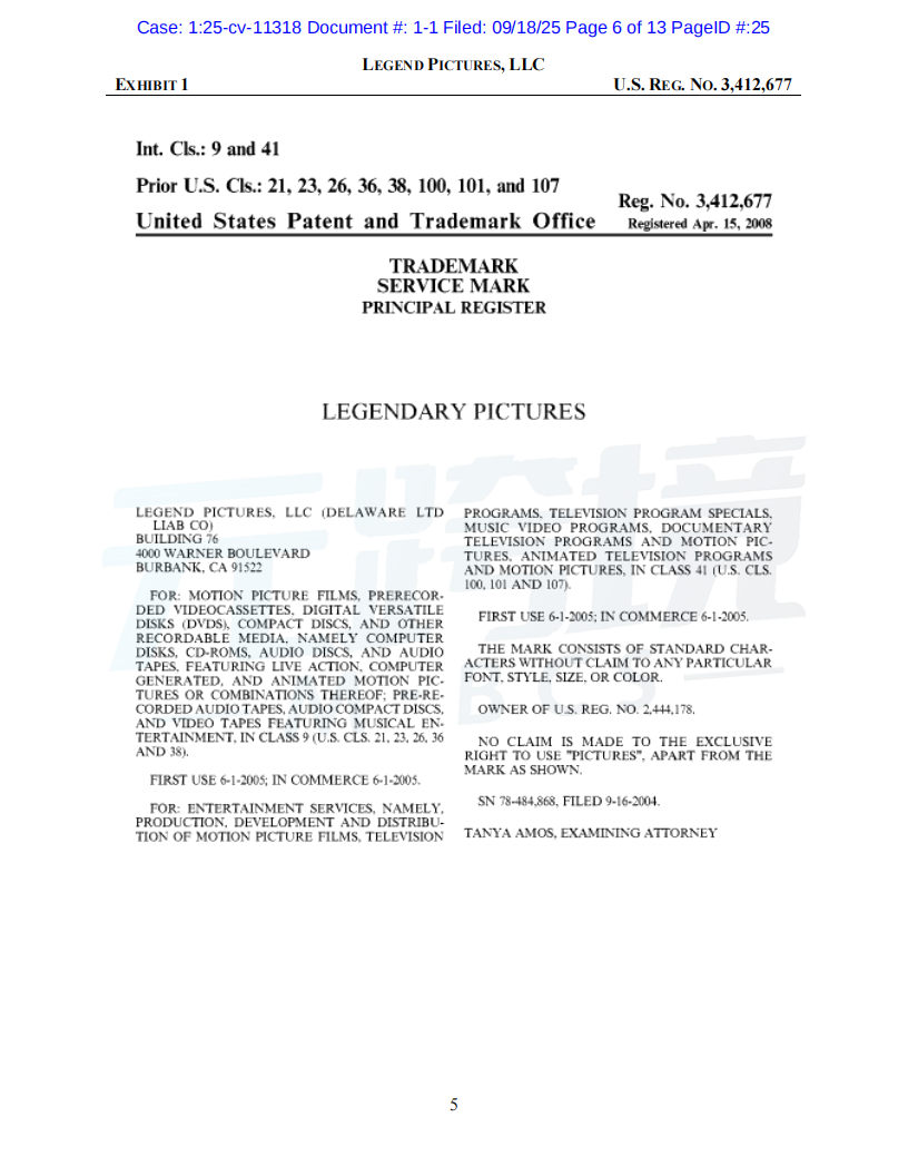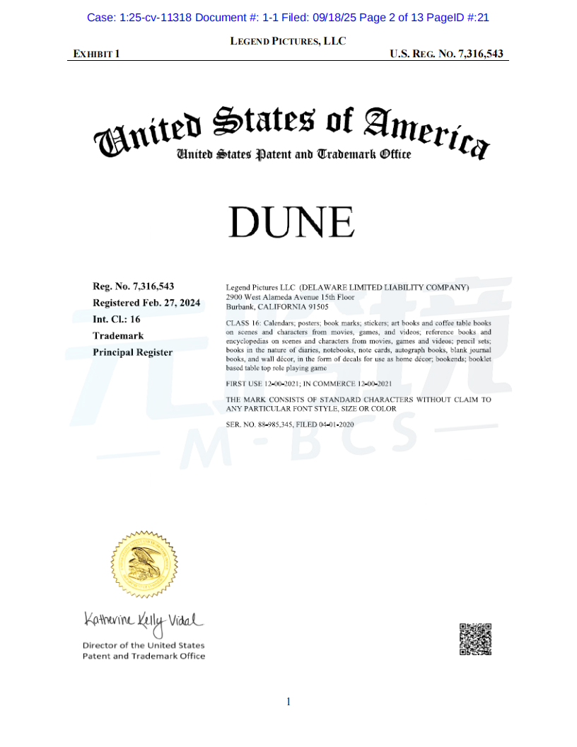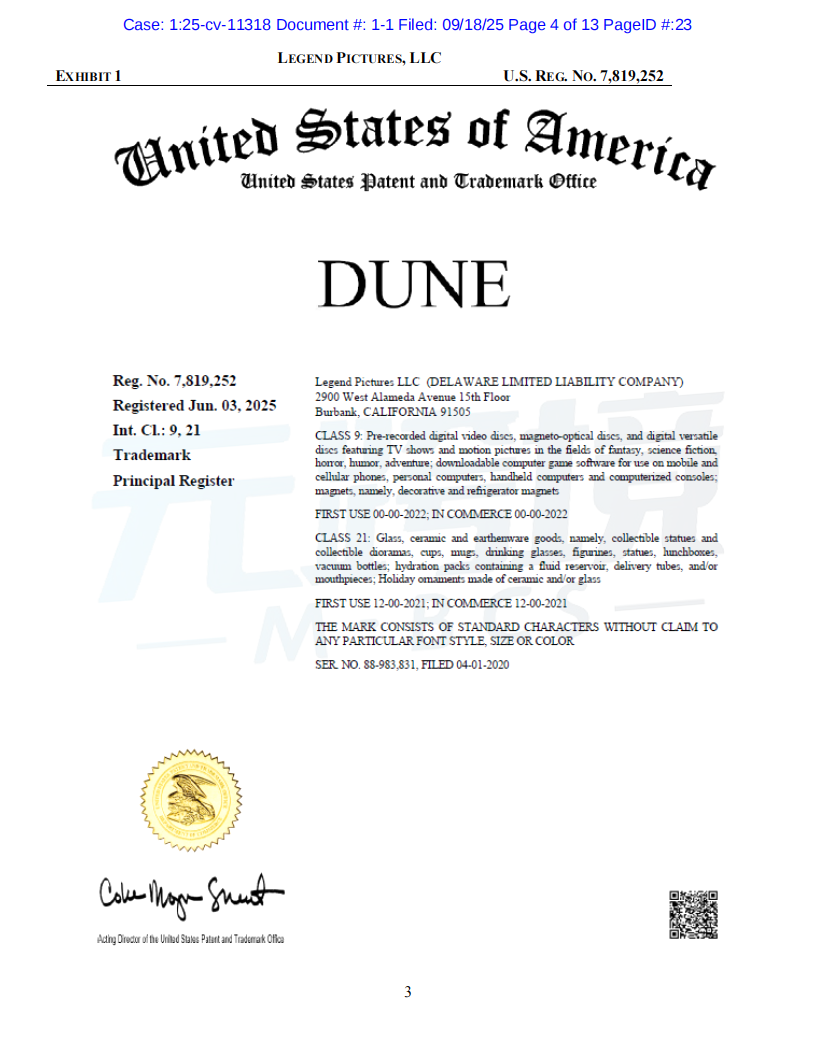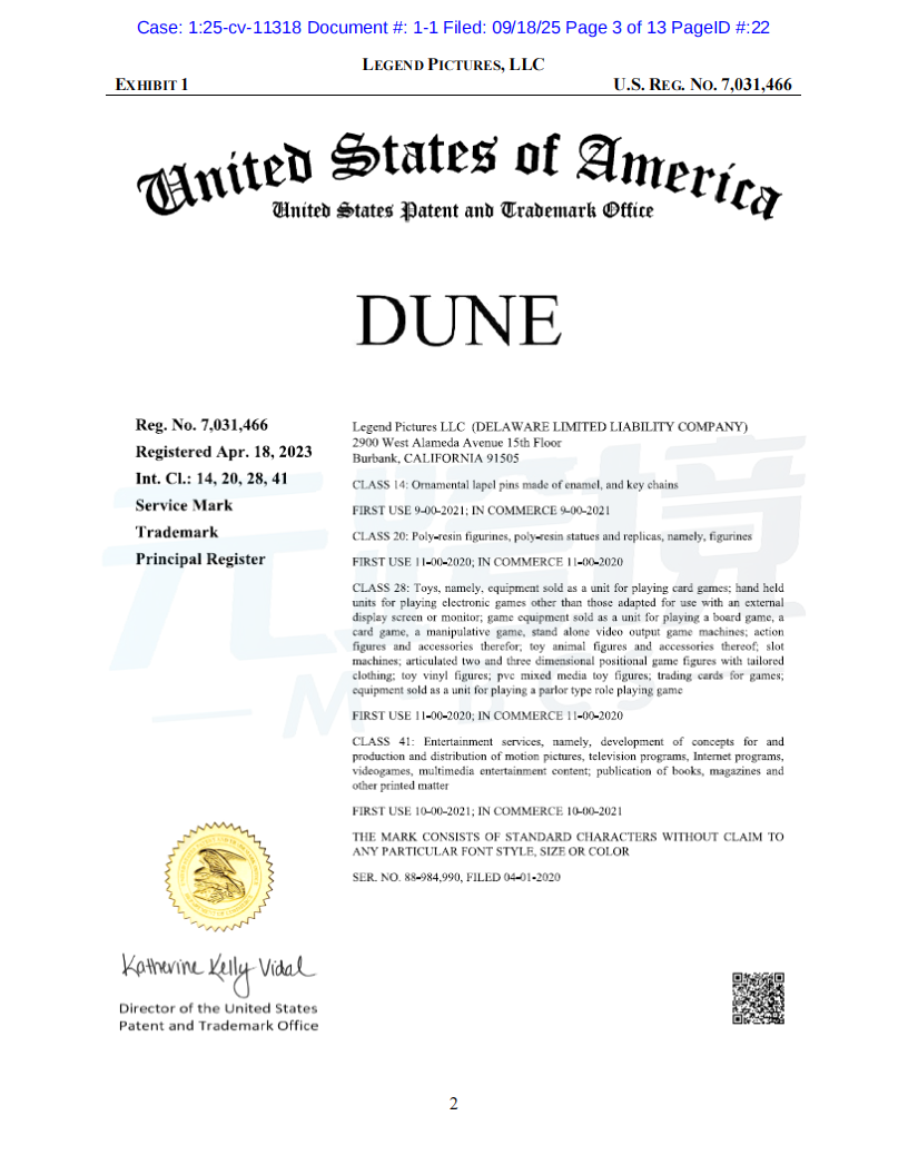 01案件基本信息原告品牌:Dune品牌方:Legend Pictures, LLC起诉时间:2025/09/18案件编号:25-cv-11318起诉类型:商标原告律所:Sullivan & Carter LLP受理法院: 伊利诺伊州北区地方法院02案件进度点击图片查看最新案件进展03品牌介绍原告传奇影业(Legend Pictures, LLC)是一家成立于2000年的美国媒体公司,总部位于加利福尼亚州伯班克。作为全球领先的内容制作和发行公司,传奇影业制作的电影在全球的票房收入已超过200亿美元。其中,《沙丘》(Dune)系列电影是其代表作之一,该系列在全球获得了超过10亿美元的票房,并拥有庞大的粉丝群体和广泛的衍生商品市场。传奇影业拥有“Dune”和“Legendary”等多个联邦注册商标,以及相关电影的版权。公司通过授权的方式,在全球范围内推广和销售正版周边商品。04维权信息本次维权为商标维权,涉及到原告名下多个商标,跨境卖家注意未经授权不得随意使用05产品实例卖家自查是否在售相关产品,请及时下架如果您不幸收到TRO邮件,店铺资金被冻结,可联系元跨境免费为您提供和解方案。如果委托元跨境为您进行和解服务,最终和解金额不接受,元跨境不收取您任何费用。