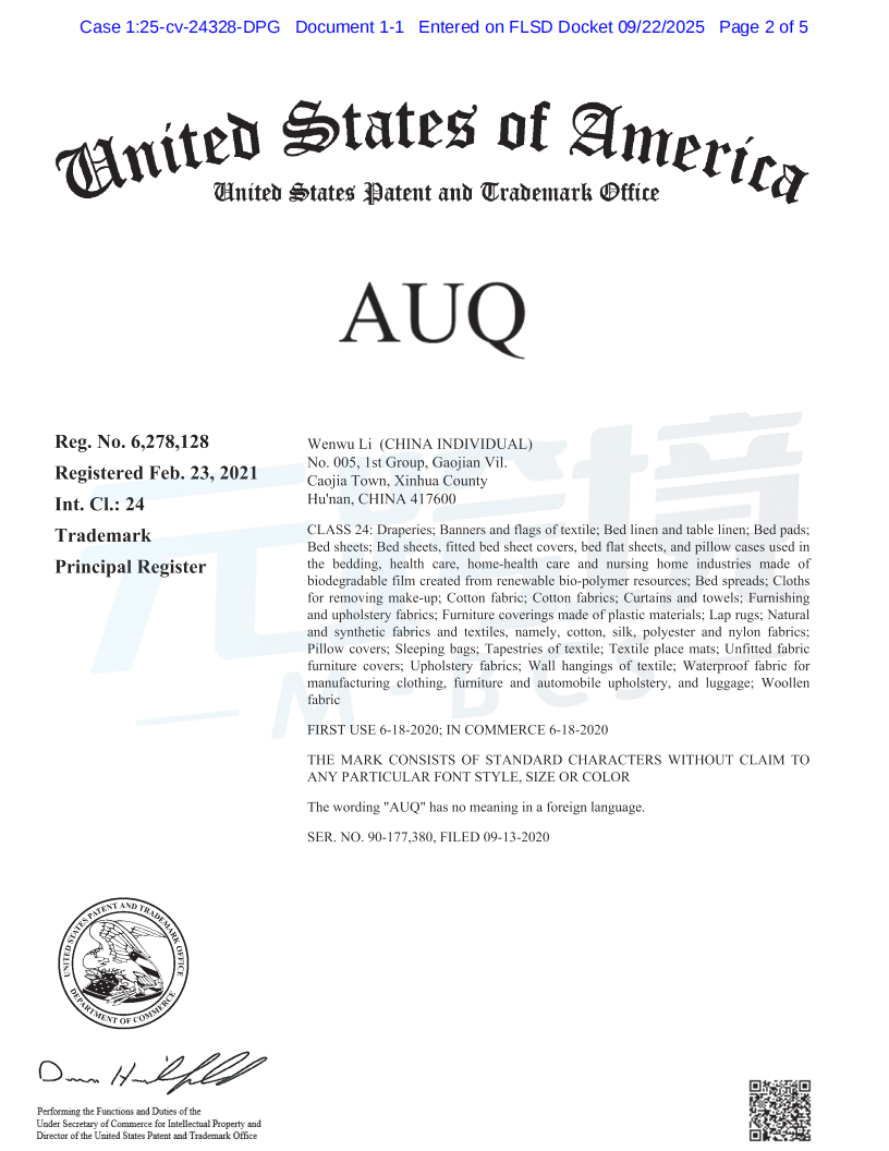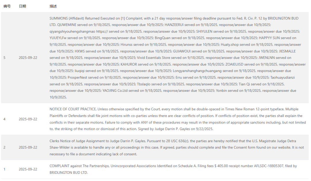 01案件基本信息原告品牌:AUQ品牌方:BRIDLINGTON BUD LTD起诉时间:2025/09/22案件编号:25-cv-24327、25-cv-24328起诉类型:商标原告律所:Palmer Law Group, PA受理法院:佛罗里达州南部地方法院02案件进度点击图片查看最新案件进展03品牌介绍BRIDLINGTON BUD LTD 是一家在英国注册的私人有限公司,主要营业地点在伦敦。该公司是美国注册商标“AUQ”(注册号6,278,128)的持有者,对该商标享有全部权利、所有权和利益。BRIDLINGTON BUD LTD 通过授权电商商家在第三方平台(如沃尔玛官网)上推广、营销和销售一系列带有“AUQ”商标的产品,这些产品属于国际分类第24类,涵盖枕套、洗碗布、窗帘、毯子、地毯、桌布、毛巾、织物家具罩等商品。04维权信息本次维权为商标维权,涉及商标如下,跨境卖家注意未经授权不得随意使用05产品实例卖家自查是否在售相关产品,请及时下架如果您不幸收到TRO邮件,店铺资金被冻结,可联系元跨境免费为您提供和解方案。如果委托元跨境为您进行和解服务,最终和解金额不接受,元跨境不收取您任何费用。